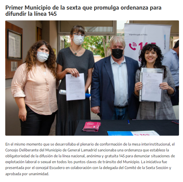 En la 1° Sesión Ordinaria del Honorable Concejo Deliberante de Gral. La Madrid, celebrada el 10 de Marzo de 2022, se presentó la ordenanza de la obligatoriedad para la difusión de la Línea 145 de atención telefónica gratuita para recibir información, solicitar asistencia y denunciar ante casos de trata de personas. La misma fue impulsada por Evangelina Castro, miembro de la Organización «Bahía Contra la Trata» y presentada en conjunto por el cuerpo deliberativo.