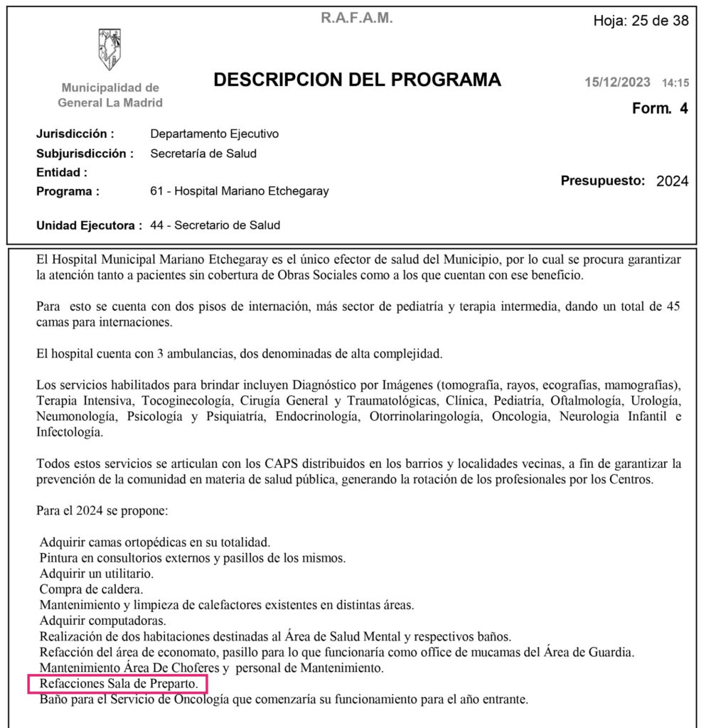 En el presupuesto para el año 2024, el Departamento Ejecutivo de la Municipalidad, específicamente en lo que respecta a la Secretaría de Salud, ha presupuestado la mejora de la Sala de Pre-parto, un reclamo que realizó el Bloque de Todos a través de este proyecto, pero que nace de los profesionales, trabajadores y trabajadoras de la salud y personas gestantes que han utilizado las instalaciones del Hospital Municipal.